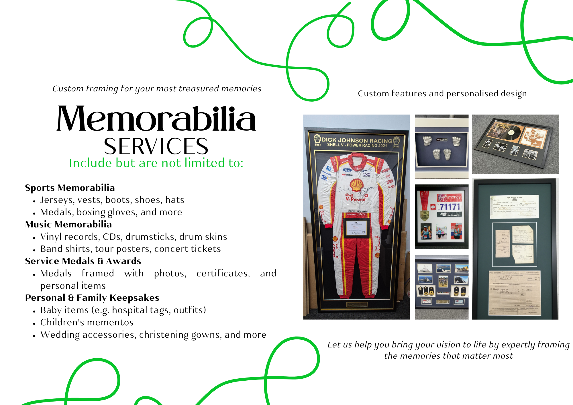 From medals, certificates, and vintage collectibles to sporting gear, concert tickets, and family heirlooms - we specialise in creating unique, high quality frames that tell your story. Every piece is thoughtfully arranged and fully customisable, with a wide choice of frame styles, mat colours, and design options to suit your vision. Whether it’s a personal achievement or a cherished keepsake, we’ll help you turn it into a lasting display.Read the full brochure here: Memorabilia Framing Brochure.png
